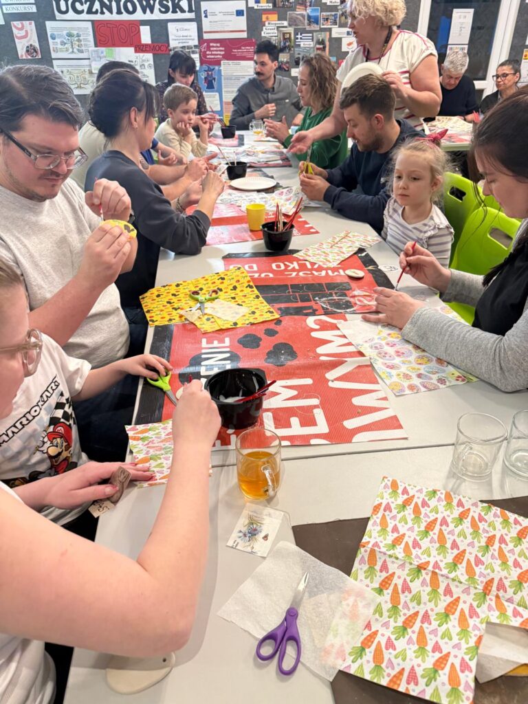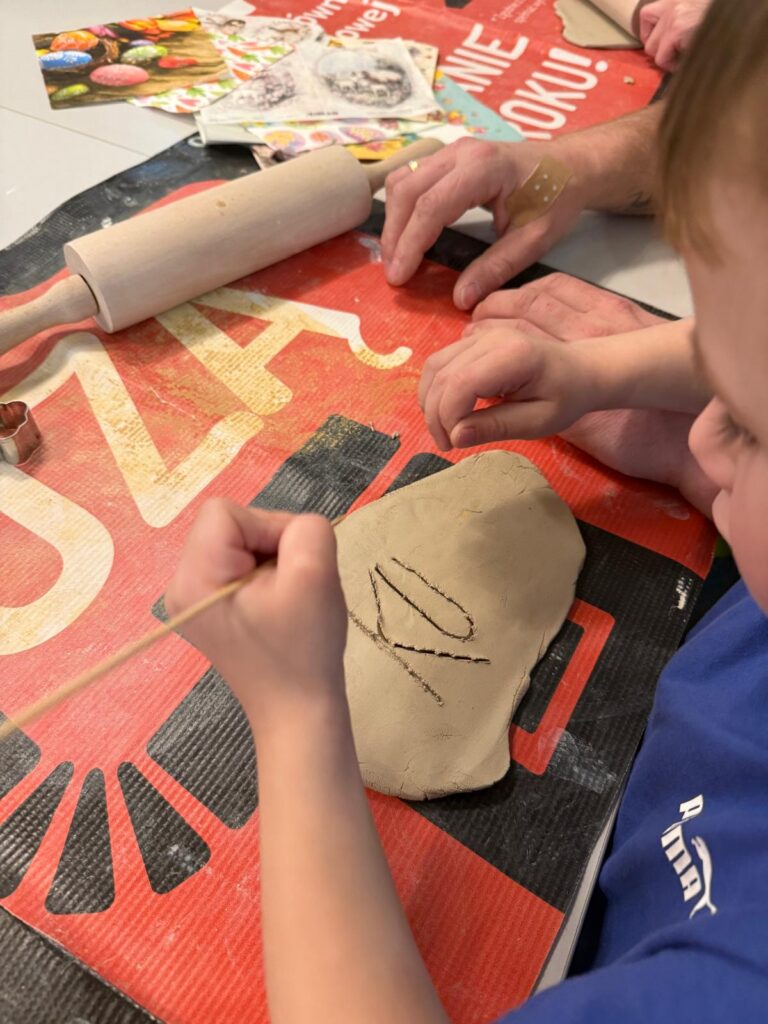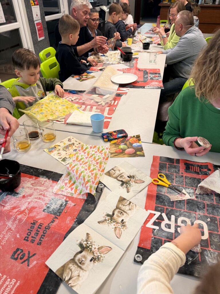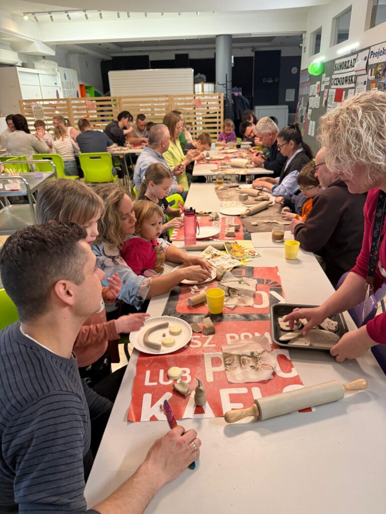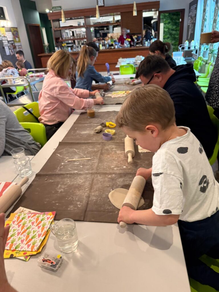 W ruch poszły wałki, glina i foremki! Dzieci, przy wsparciu rodziców, tworzyły wielkanocne króliczki, wiosenne motylki oraz wiele innych pięknych kształtów. Na koniec ozdabiali je kolorowymi wzorami wycinanymi z serwetek. Po twórczej pracy na wszystkich czekał pyszny poczęstunek .